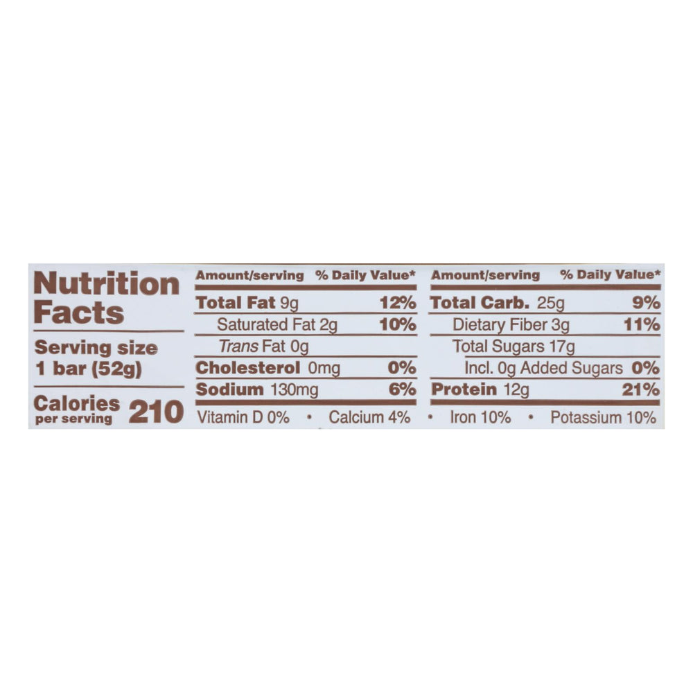RXBar creates gluten-free snacks designed with simple, real ingredients. The 12 g Protein Bar offers a healthy, protein-packed snack for those on the go. Made in the United States, this bar is also kosher, yeast-free, and contains no b.s. Each bar is 1.83 oz and the box contains a pack of 12 bars. Ingredients: - 3 Egg Whites - 3 Walnuts - 6 Cashews - 2 Dates - Bananas - Chocolate - Cinnamon - Natural Flavors The quantities of the ingredients stated on the front of the package are determined by net weight. RXBar is committed to providing simple, delicious snacks with no added nonsense.