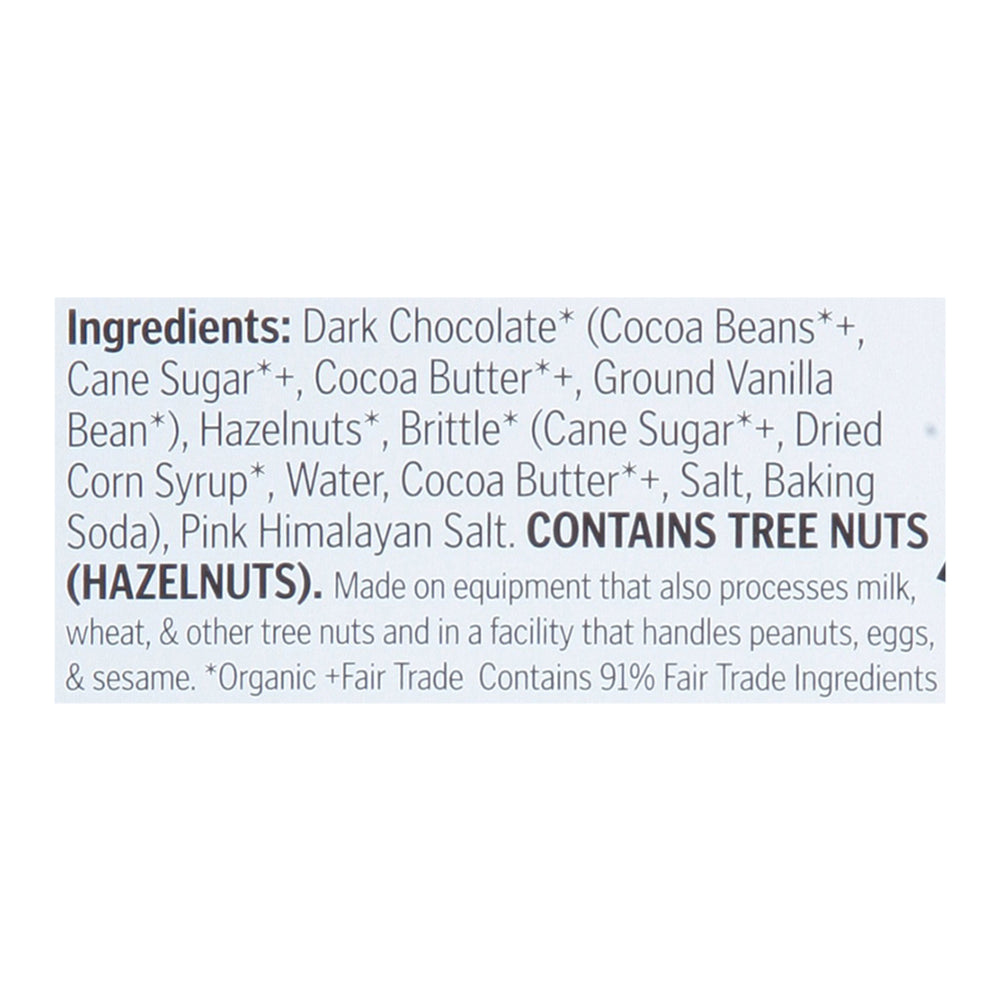 - Ingredients: Dark Chocolate* (Cocoa Beans*+, Cane Sugar*+, Cocoa Butter*+, Ground Vanilla Bean*), Hazelnuts, Brittle* (Cane Sugar*+, Dried Corn Syrup*, Water, Cocoa Butter*+, Salt, Baking Soda), Pink Himalayan Salt