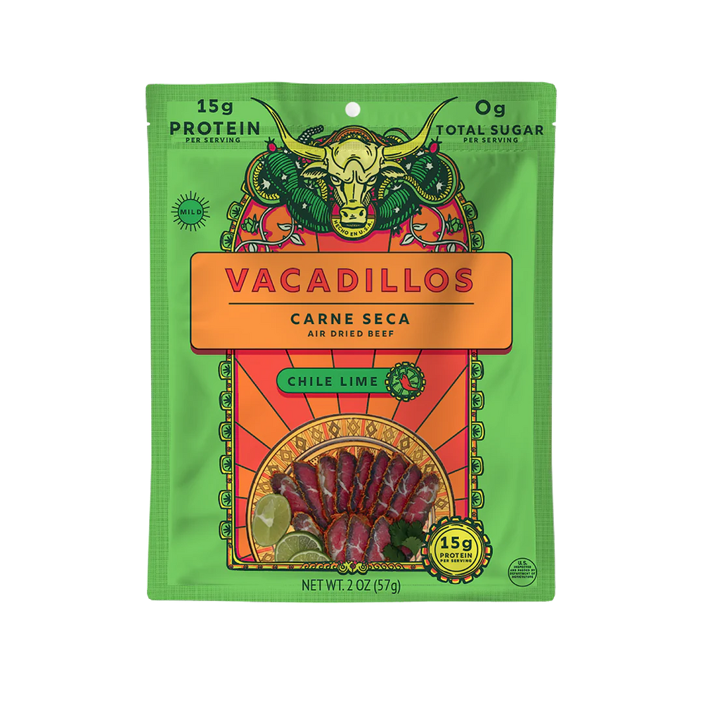 Experience the bold flavor and satisfying protein of Vacadillos Air-Dried Beef Steak Chili. Order your 12-pack today and elevate your snacking game!