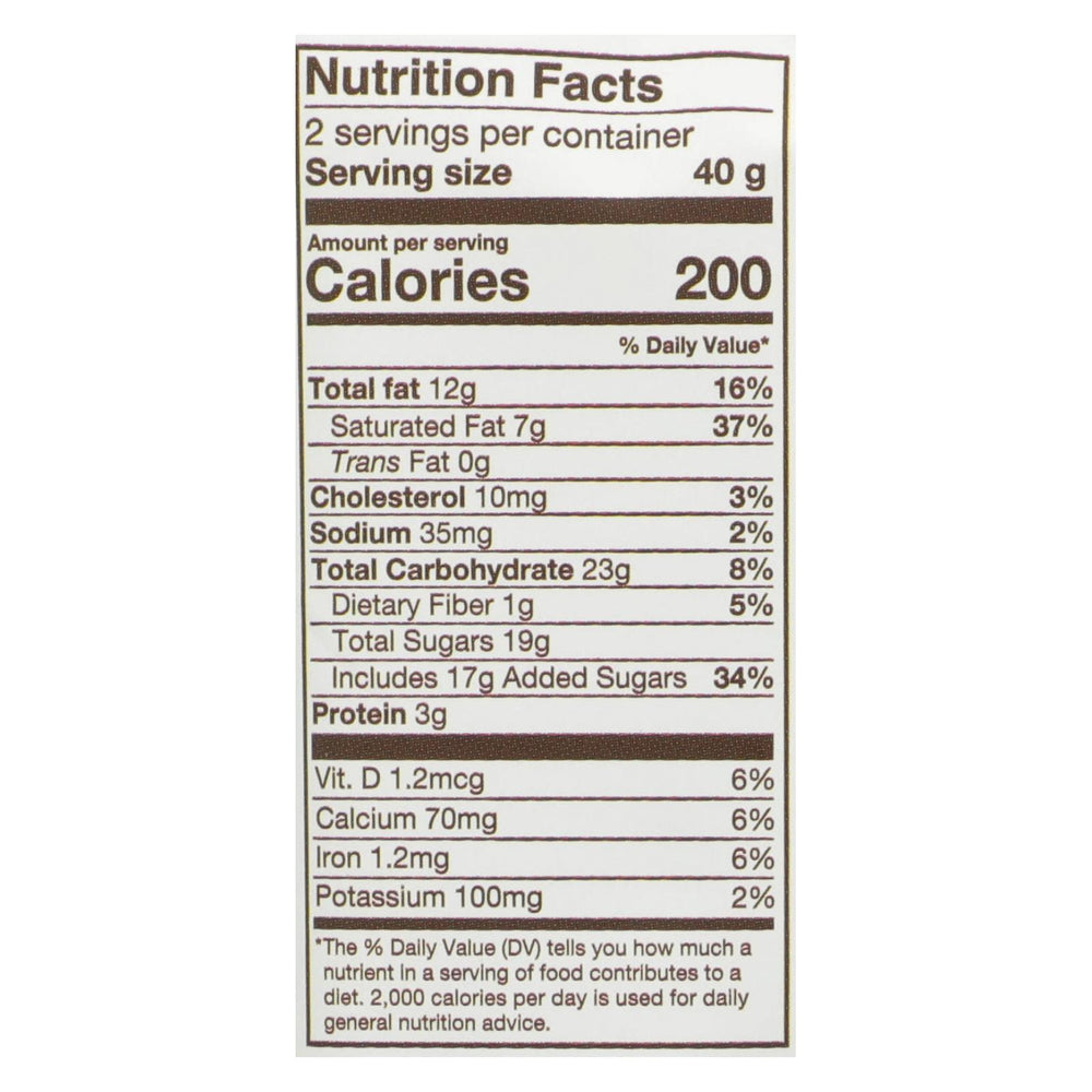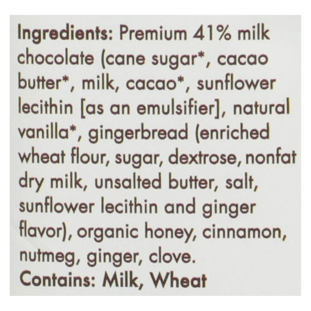 Ingredientes: chocolate con leche premium 41%; azúcar de caña; manteca de cacao; leche; cacao; lecitina de girasol [como emulsionante]; vainilla natural; pan de jengibre; harina de trigo enriquecida; azúcar; dextrosa; leche en polvo descremada; mantequilla sin sal; sal; lecitina de girasol y sabor a jengibre; miel orgánica; canela; nuez moscada; jengibre; clavo de olor.