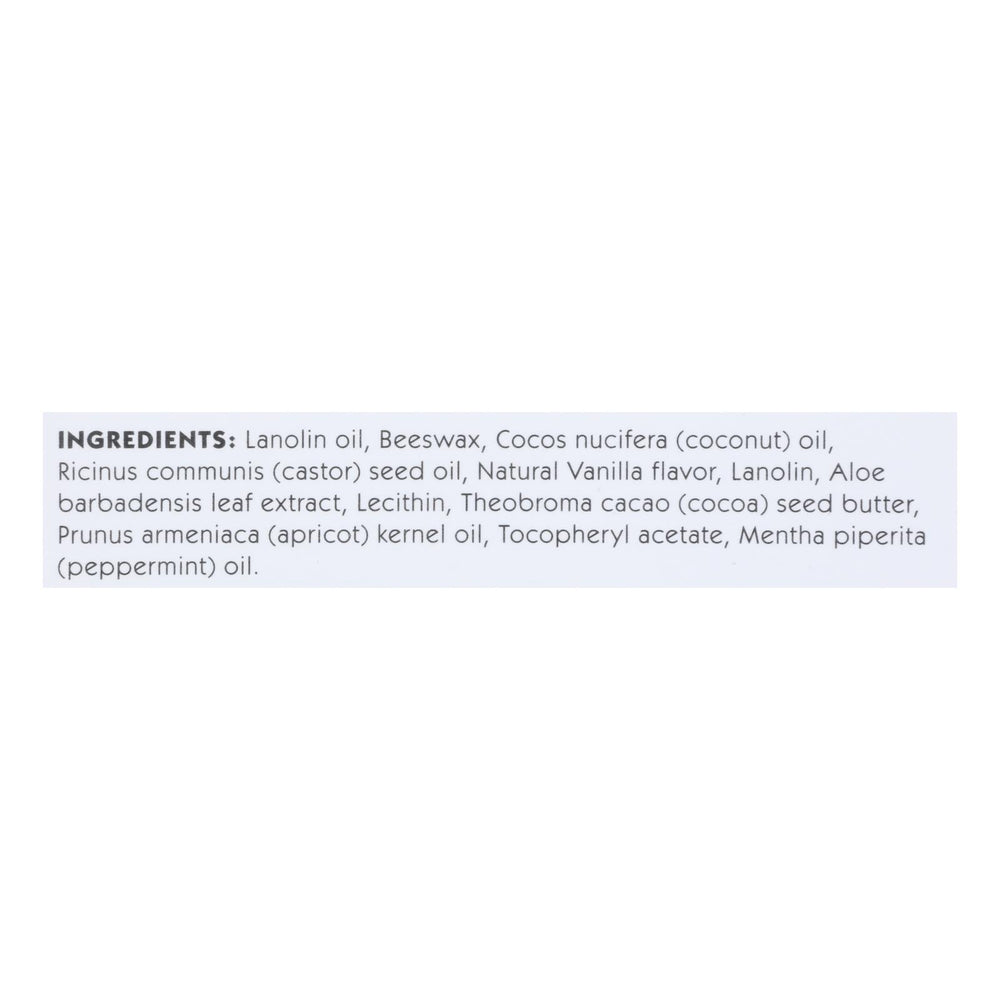 Ingredientes: aceite de lanolina, cera de abejas, aceite de coco (cocos nucifera), aceite de semilla de ricinus communis (ricino), sabor natural a vainilla, lanolina, extracto de hoja de aloe barbadensis, lecitina, manteca de semilla de theobroma cacao (cacao), aceite de semilla de prunus armeniaca (albaricoque), acetato de tocoferol, aceite de mentha piperita (menta).