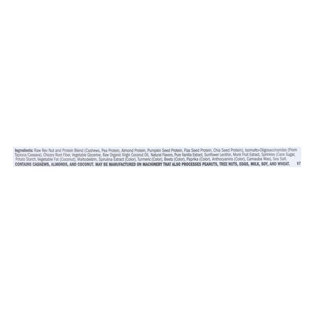 Ingredientes: mezcla de nueces y proteínas crudas (anacardos, proteína de guisante, proteína de almendra, proteína de semilla de calabaza, proteína de semilla de lino, proteína de semilla de chía); isomaltoligosacáridos (de tapioca/yuca); fibra de raíz de achicoria; glicerina vegetal; virgen orgánica cruda aceite de coco, sabores naturales, extracto puro de vainilla, lecitina de girasol, extracto de fruta del monje, chispas (azúcar de caña, almidón de patata, grasa vegetal (coco), maltodextrina, extracto de espirulina (color), cúrcuma (color), remolacha (color), paprika (color), antocianinas (color), ca
