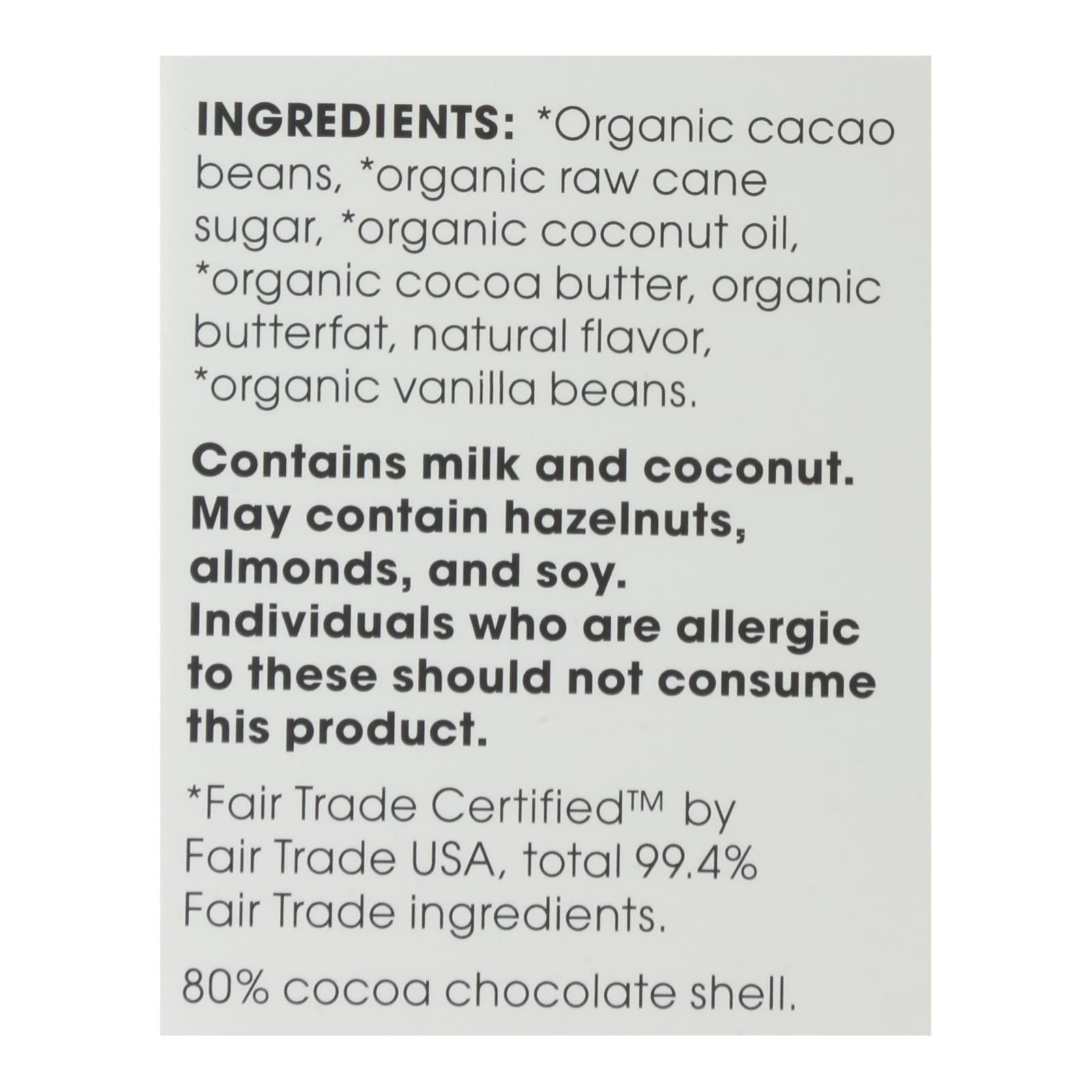 - Ingredientes: Jugo de caña evaporado orgánico, licor de chocolate orgánico, aceite de palma orgánico, manteca de cacao orgánica, extracto de trufa orgánica.