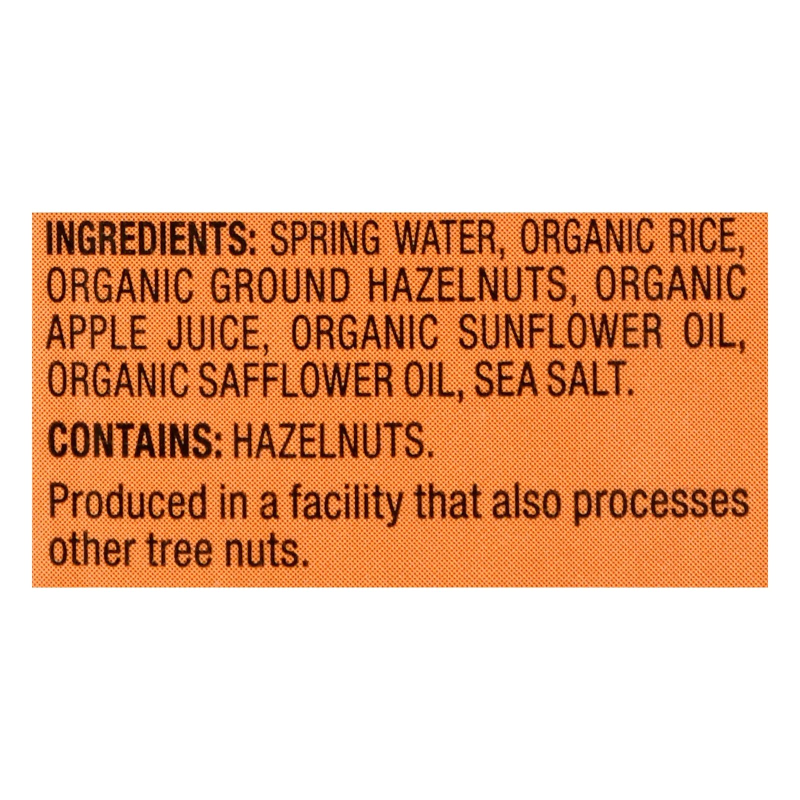 ingredientes: agua de manantial, arroz orgánico, avellanas molidas orgánicas, jugo de manzana orgánico, aceite de girasol orgánico, aceite de cártamo orgánico, sal marina