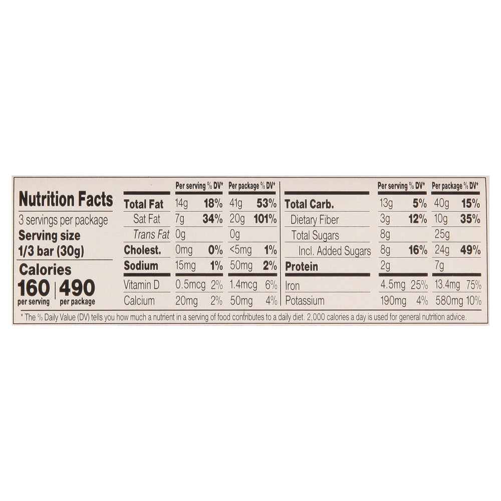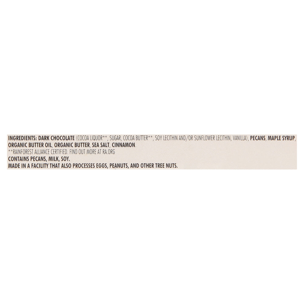 ingredientes : chocolate negro (licor de cacao**, azúcar, manteca de cacao**, lecitina de soja y/o lecitina de girasol, vainilla); nueces pecanas; jarabe de arce; aceite de mantequilla orgánica; mantequilla orgánica; sal marina; canela