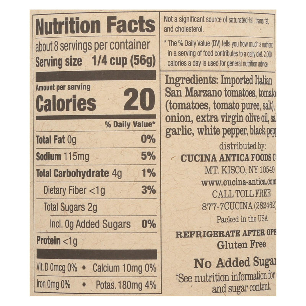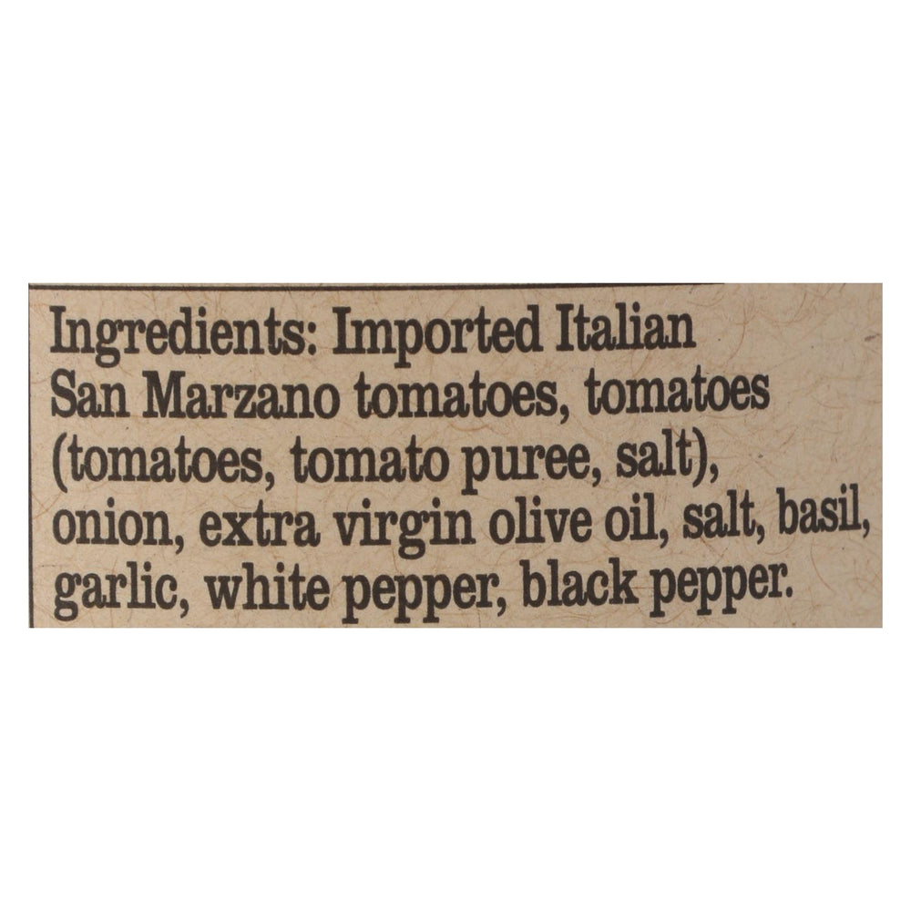 - Natural Ingredients: Ingredients include imported italian tomatoes, tomatoes (tomatoes, tomato puree, salt), onion, extra virgin olive oil, salt, basil, garlic, white pepper, and black pepper.