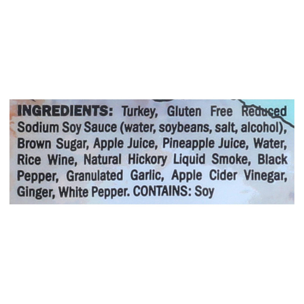 Turkey; gluten free reduced sodium soy sauce (water, soybeans, salt, alcohol); brown sugar; apple juice; pineapple juice; water; rice wine; natural hickory liquid smoke; black pepper; granulated garlic; apple cider vinegar; ginger; white pepper.