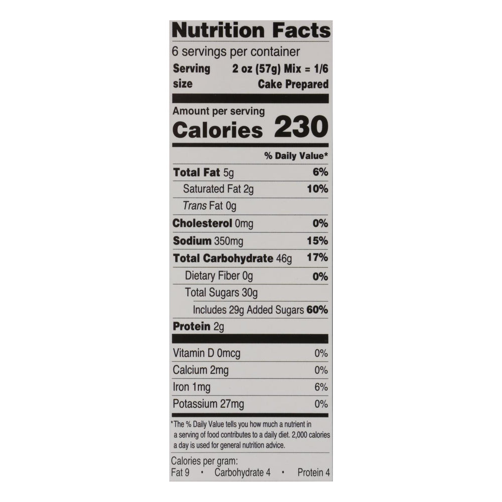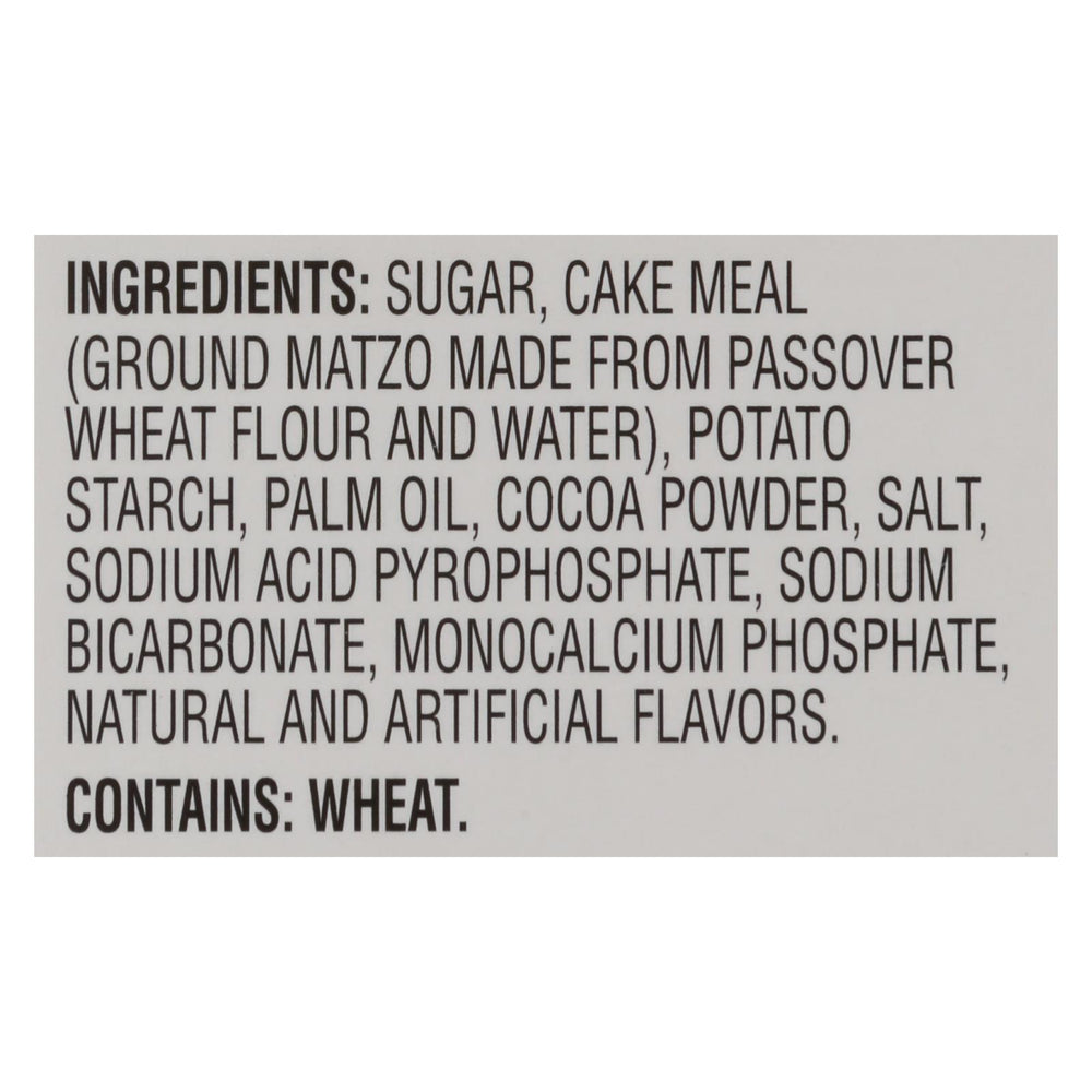 Ingredientes: azúcar, harina de repostería (matzá molido elaborado con harina de trigo de Pascua y agua), almidón de patata, aceite de palma, cacao en polvo, sal, pirofosfato ácido de sodio, bicarbonato de sodio, fosfato monocálcico, sabores naturales y artificiales.