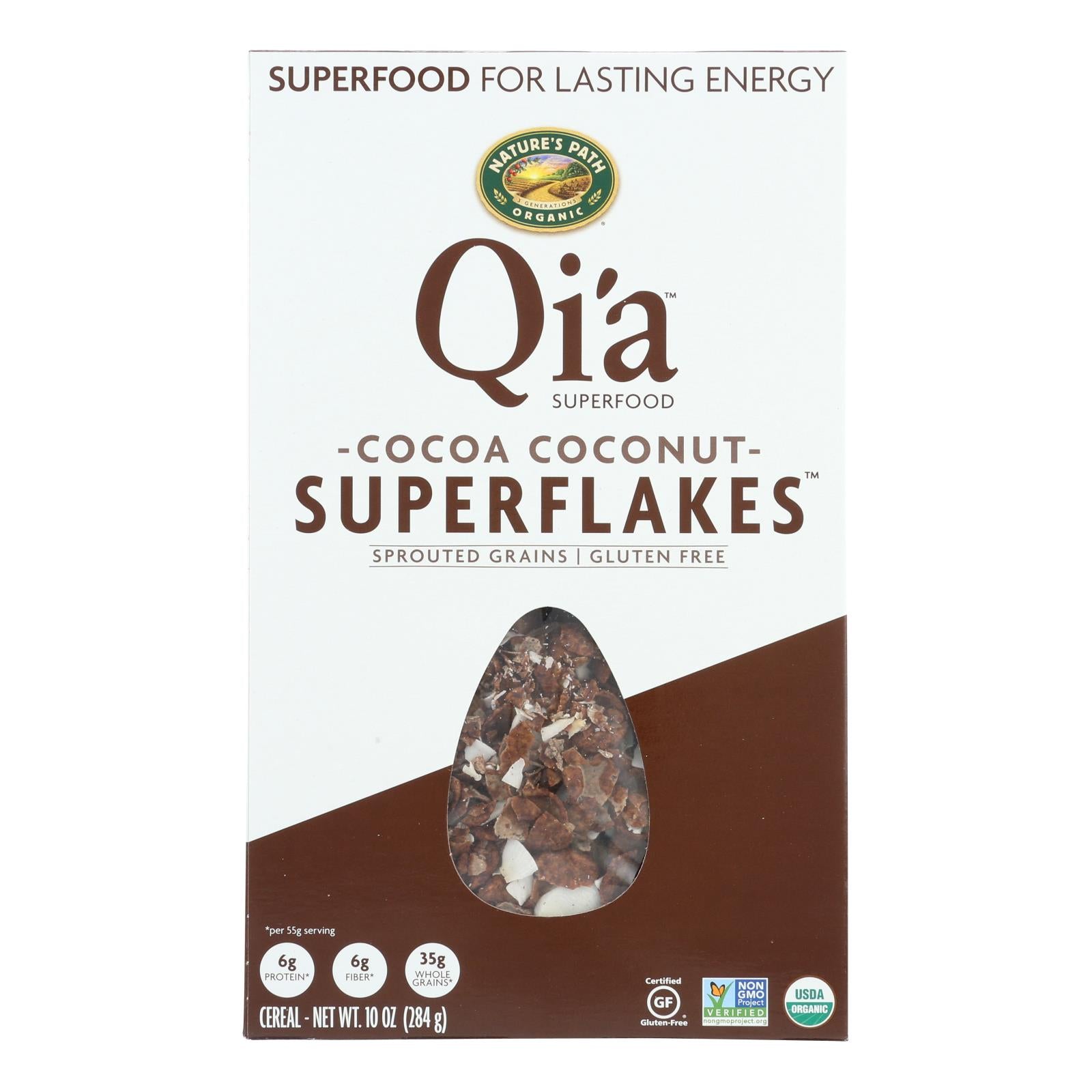 Deléitese con el rico y satisfactorio sabor de Nature's Path Organic Qi'a Superflakes Cocoa Coconut Indulgence , una mezcla cautivadora de granos saludables y sabores deliciosos que elevarán su experiencia de desayuno a nuevas alturas.
