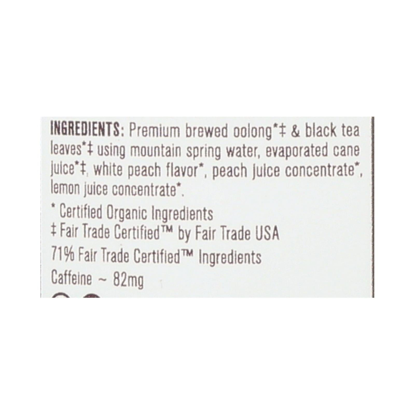 Los ingredientes incluyen cerveza premium de oolong orgánico certificado de comercio justo; hojas de té de Assam orgánicas certificadas de comercio justo y hongo reishi orgánico en agua mineral de manantial; jugo de caña evaporado orgánico certificado de comercio justo; sabor a melocotón blanco orgánico; concentrado de jugo de melocotón orgánico; concentrado de jugo de limón orgánico.