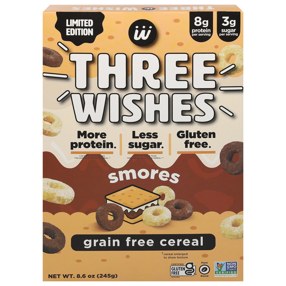 El cereal Three Wishes S'mores ofrece una forma deliciosa y nutritiva de disfrutar de tu antojo favorito. Elaborado con ingredientes vegetales integrales y sin cereales, gluten ni lácteos, este cereal ofrece un capricho sin remordimientos que todos pueden disfrutar. Cada porción ofrece una textura crujiente y el equilibrio perfecto de sabores a galleta graham, malvavisco y chocolate. Este cereal se elabora en EE. UU., garantizando altos estándares de calidad y apoyando la producción local.