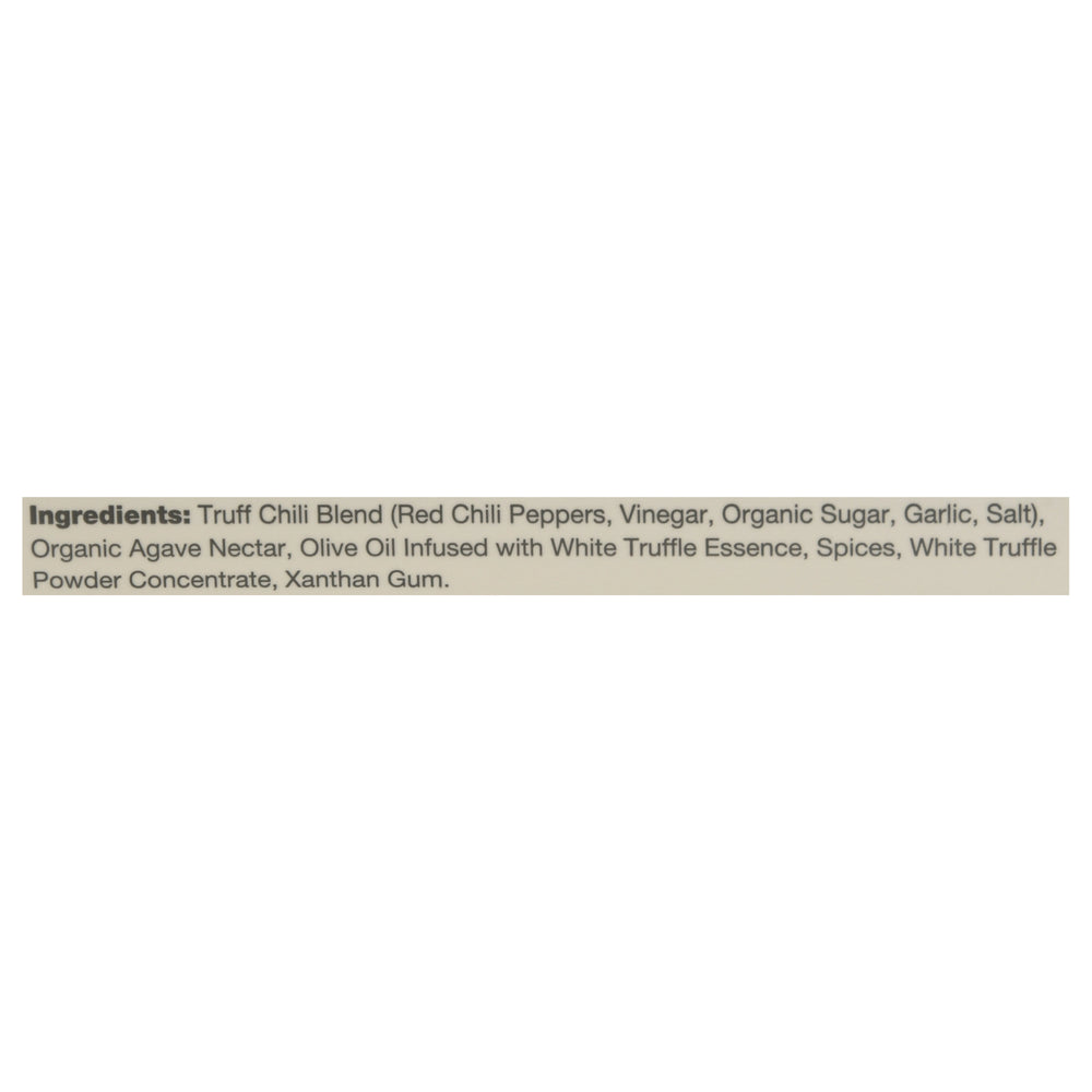 ingredientes : mezcla de chile truff® (chiles rojos, agua, vinagre, azúcar orgánica, ajo, sal); néctar de agave orgánico; aceite de oliva infundido con esencia de trufa blanca; especias; goma xantana; concentrado de trufa blanca en polvo; trufa blanca (tuber magnatum )