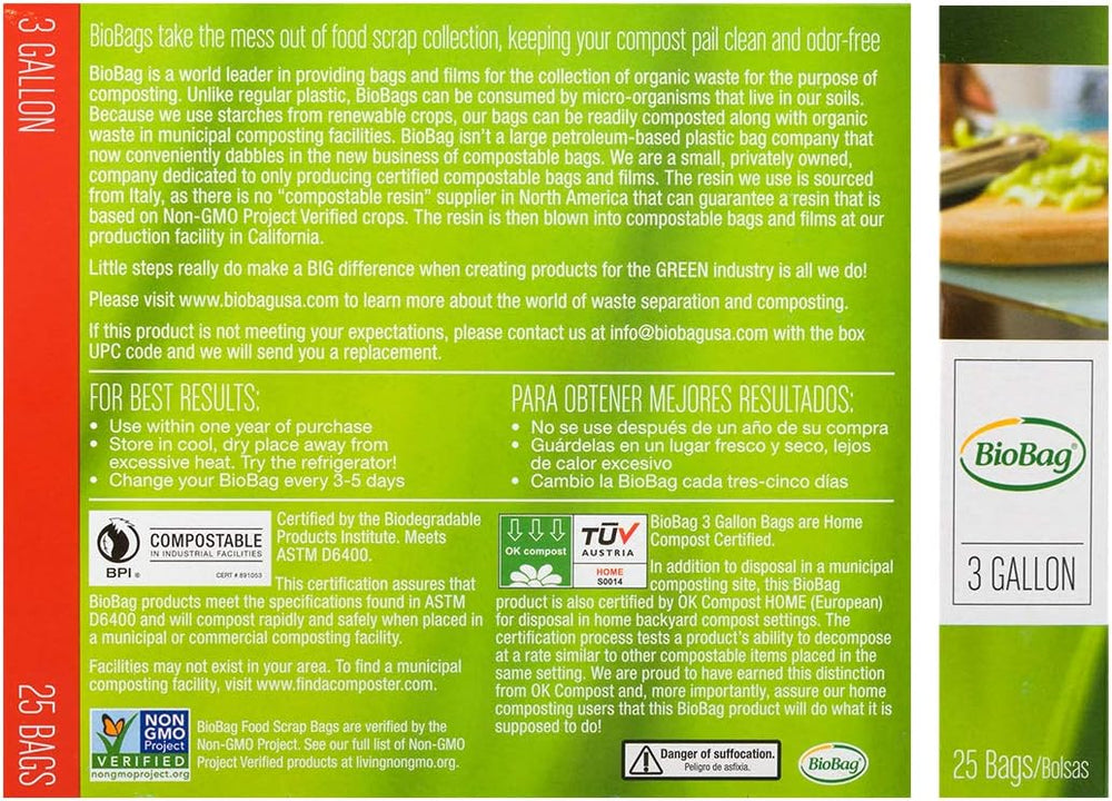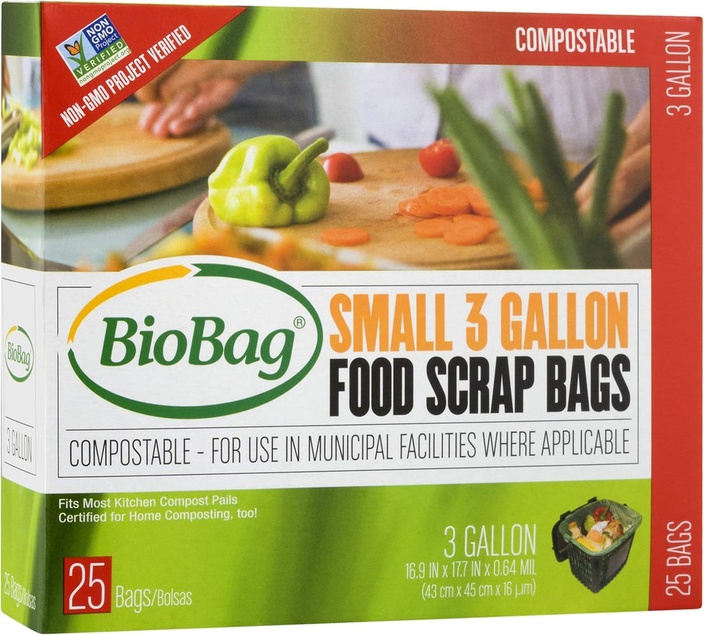 Biobag Food Scraps Compostable Bags make collecting kitchen food waste easy, clean, and sustainable. Made from plant-based materials, these 3-gallon bags are certified compostable and break down naturally in your compost pile along with your food scraps. Perfect for countertop compost bins, these eco-friendly liners keep your food scrap collection mess-free while reducing plastic waste.