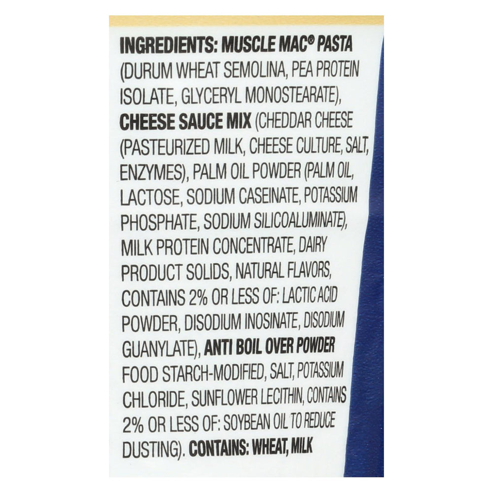 ingredients : muscle mac® pasta;durum wheat semolina;pea protein isolate;glyceryl monostearate;cheddar cheese seasoning;cheddar cheese;cultured pasteurized milk;salt;enzymes;nonfat dry milk;whey;butter;pasteurized cream;yeast extract;anti boil over powder;modified food starch;potassium chloride;sunflower lecithin;contains 2% or less of: soybean oil to reduce dusting
