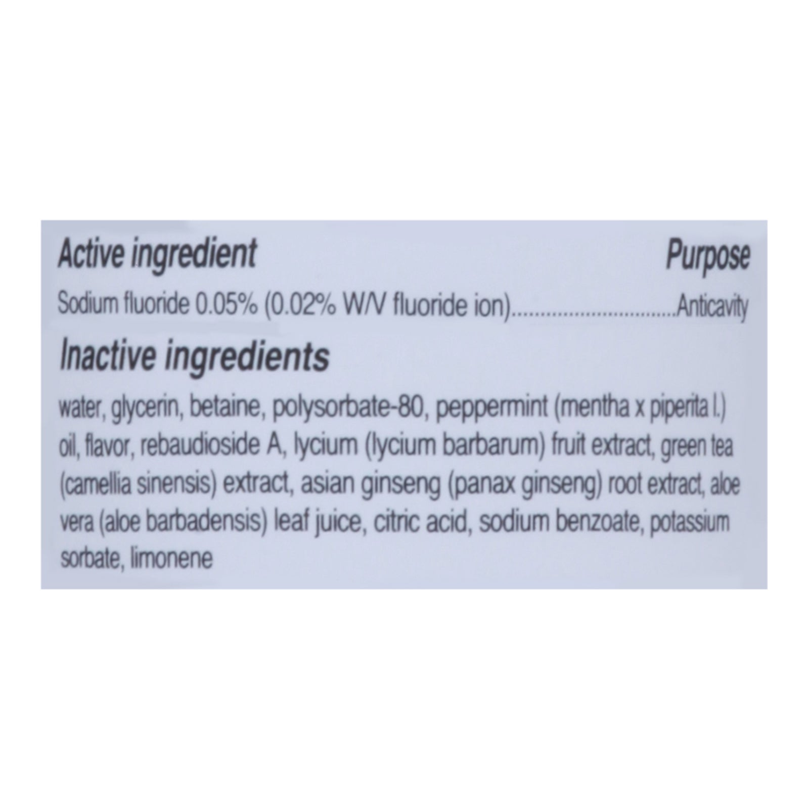 - Ingredients: Sodium Fluoride 0.05%, Water, Glycerin, Betaine, Polysorbate-80, Peppermint (Mentha X Piperita L.) Oil, Flavor, Rebaudioside A, Lycium (Lycium Barbarum) Fruit Extract, Green Tea (Camellia Sinensis) Extract, Asian Ginseng (Panax Ginseng) Root Extract, Aloe Vera (Aloe Barbadensis) Leaf Juice, Citric Acid, Sodium Benzoate, Potassium Sorbate, and Limonene.