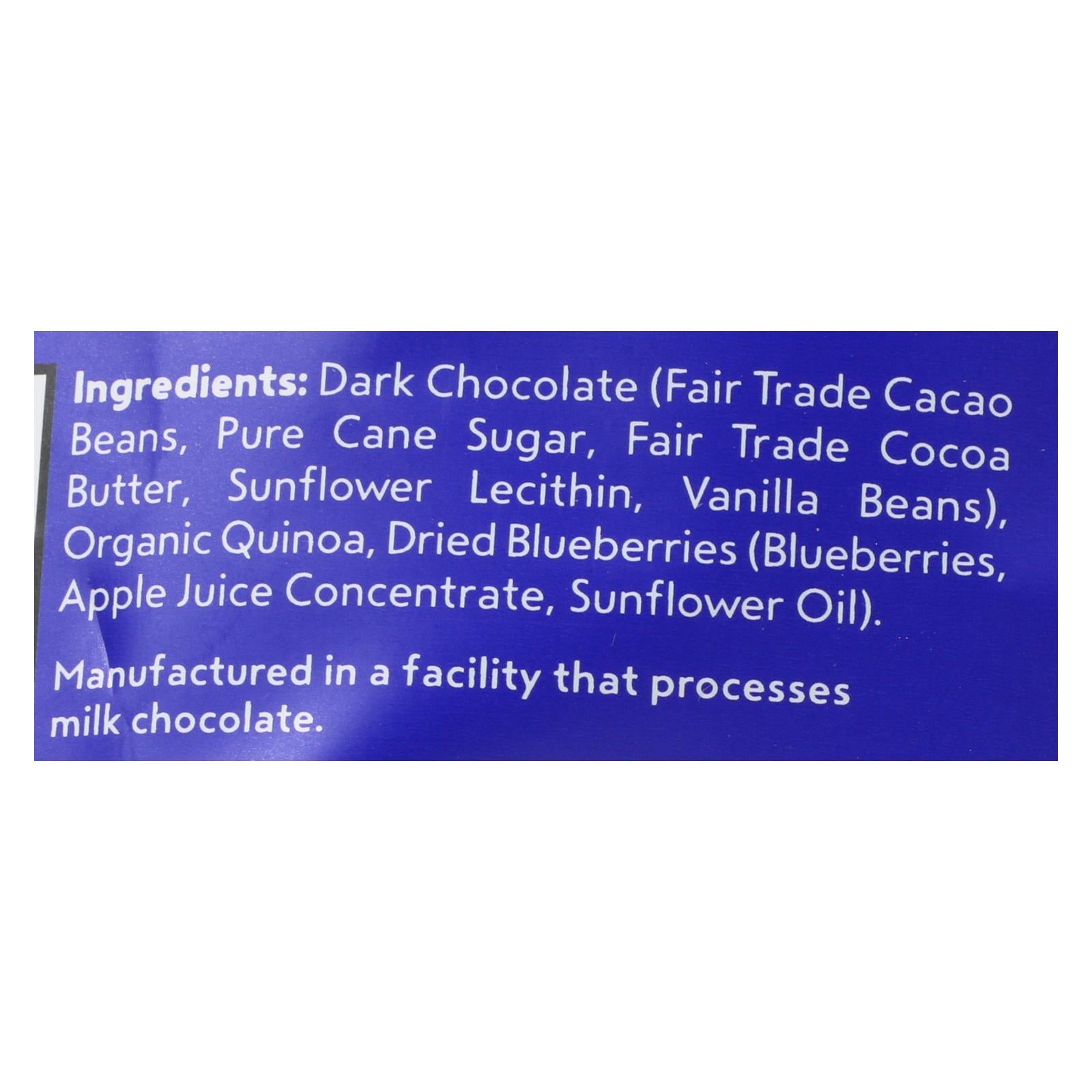 ingredients : dark chocolate;cacao beans;pure cane sugar;cocoa butter;sunflower lecithin;vanilla beans;organic quinoa;dried blueberries;blueberries;apple juice concentrate;sunflower oil