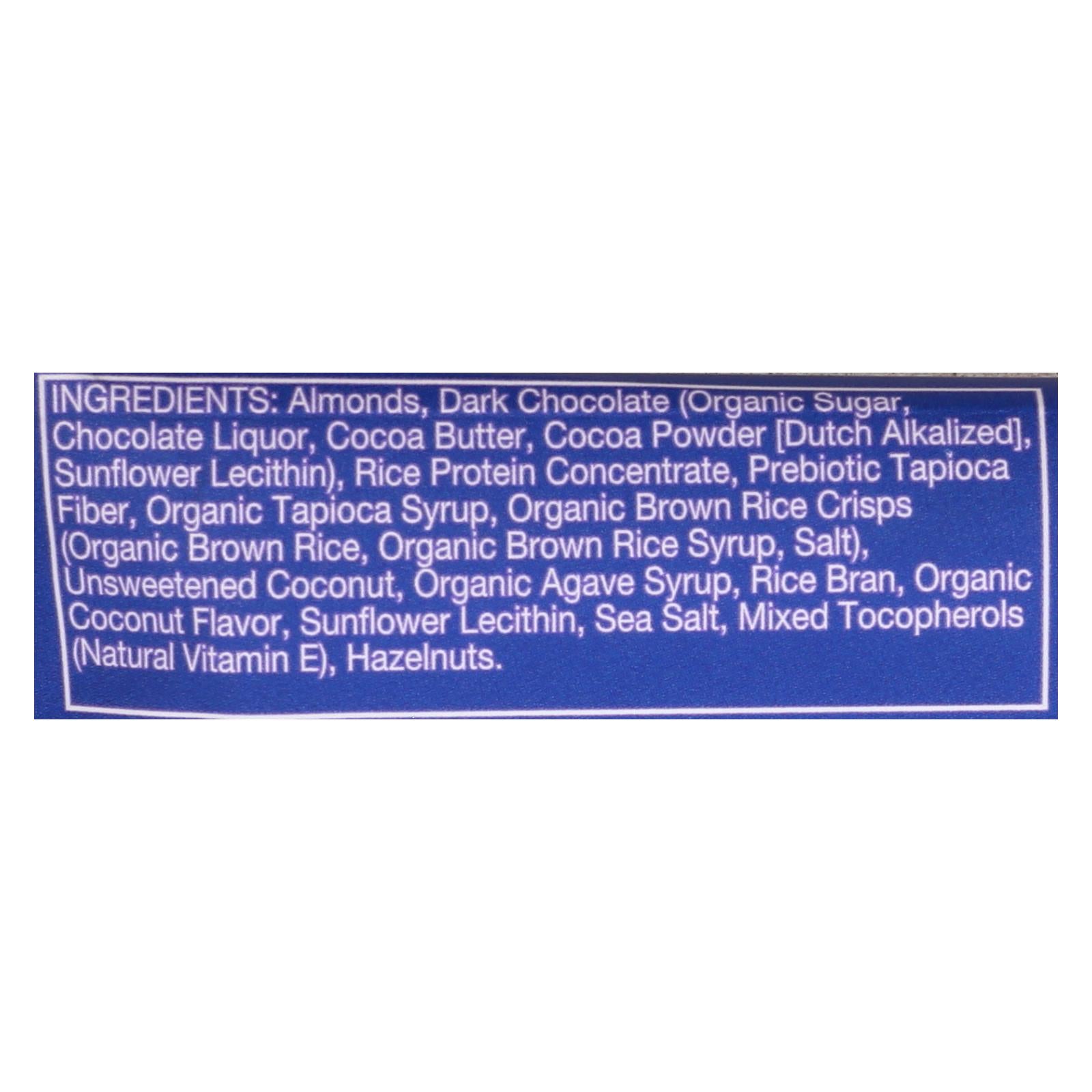 ingredients : almonds;dark chocolate;organic sugar;chocolate liquor;cocoa butter;cocoa powder [dutch alkalized];sunflower lecithin;rice protein concentrate;prebiotic tapioca fiber;organic tapioca syrup;organic brown rice crisps;organic brown rice;organic brown rice syrup;salt;unsweetened coconut;organic agave syrup;rice bran;organic coconut flavor;sea salt;mixed tocopherols;natural vitamin e;hazelnuts
