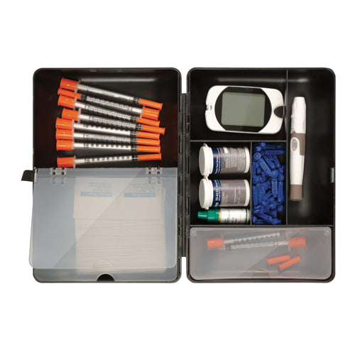 这款糖尿病用品箱设计便捷,安心无忧。无需再翻箱倒柜地寻找所需物品。所有物品都井井有条,轻松取用。